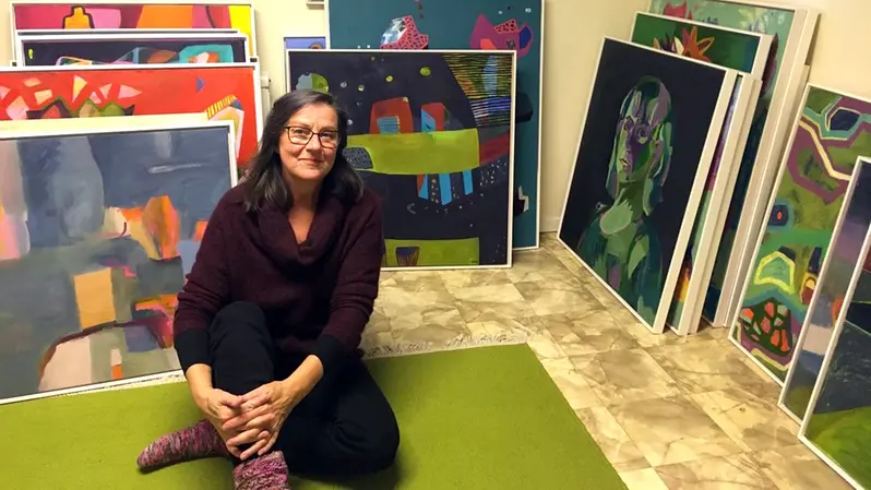 Arbetar främst med akrylmåleri och söker ständigt efter olika färg- och formkombinationer.
