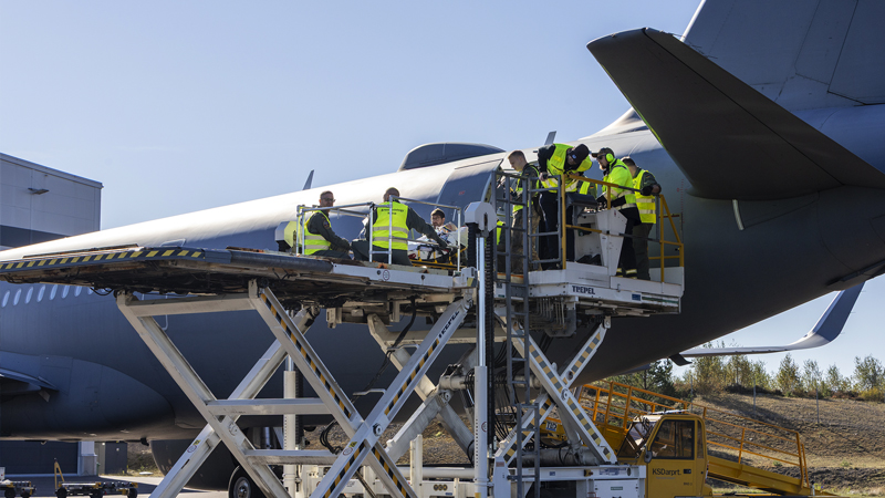 De fiktiva patienterna flögs in på riktigt från Norge, Tyskland och Nederländerna, till exempel med stora transportflygplanet TP 84 Hercules.