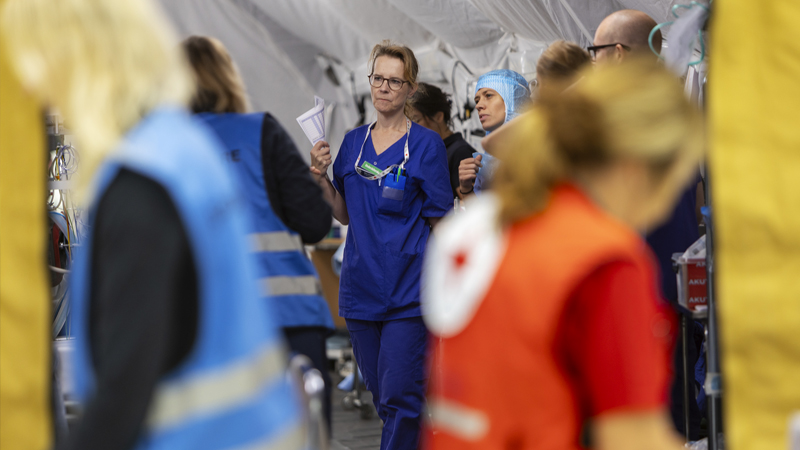 Det råder ett lugn i den stora hangaren på Karlstad airport. Under förmiddagen har nya fiktiva patienter anlänt med flygplan till den tillfälliga sjukvårdsenheten som byggts upp tidigare under veckan. Efter några intensiva timmar kan vårdpersonalen andas ut för en kort stund. Men så plötsligt tystnar det uppsluppna sorlet från de olika avdelningarna. I nästa sekund strömmar vårdpersonal mot övningens akutmottagning och blickar mot landningsbanan.