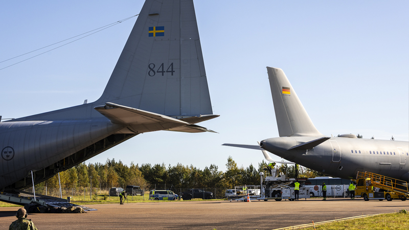 Det är dag tre på den stora civila beredskapsövningen Resilient care 25 och klockan är 10.52 när det tyska flygvapnet landar med sårade och sjuka.