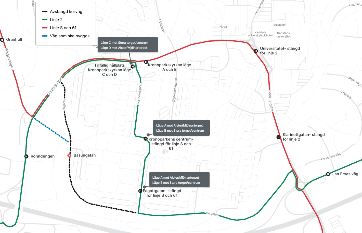 - Hållplats Kronoparkskyrkan får två nya lägen för linje 2, placerade på Posthornsgatan. (Läge C mot Stora torget/Centrum. Läge D mot Alster/Mjölnartorpet.)